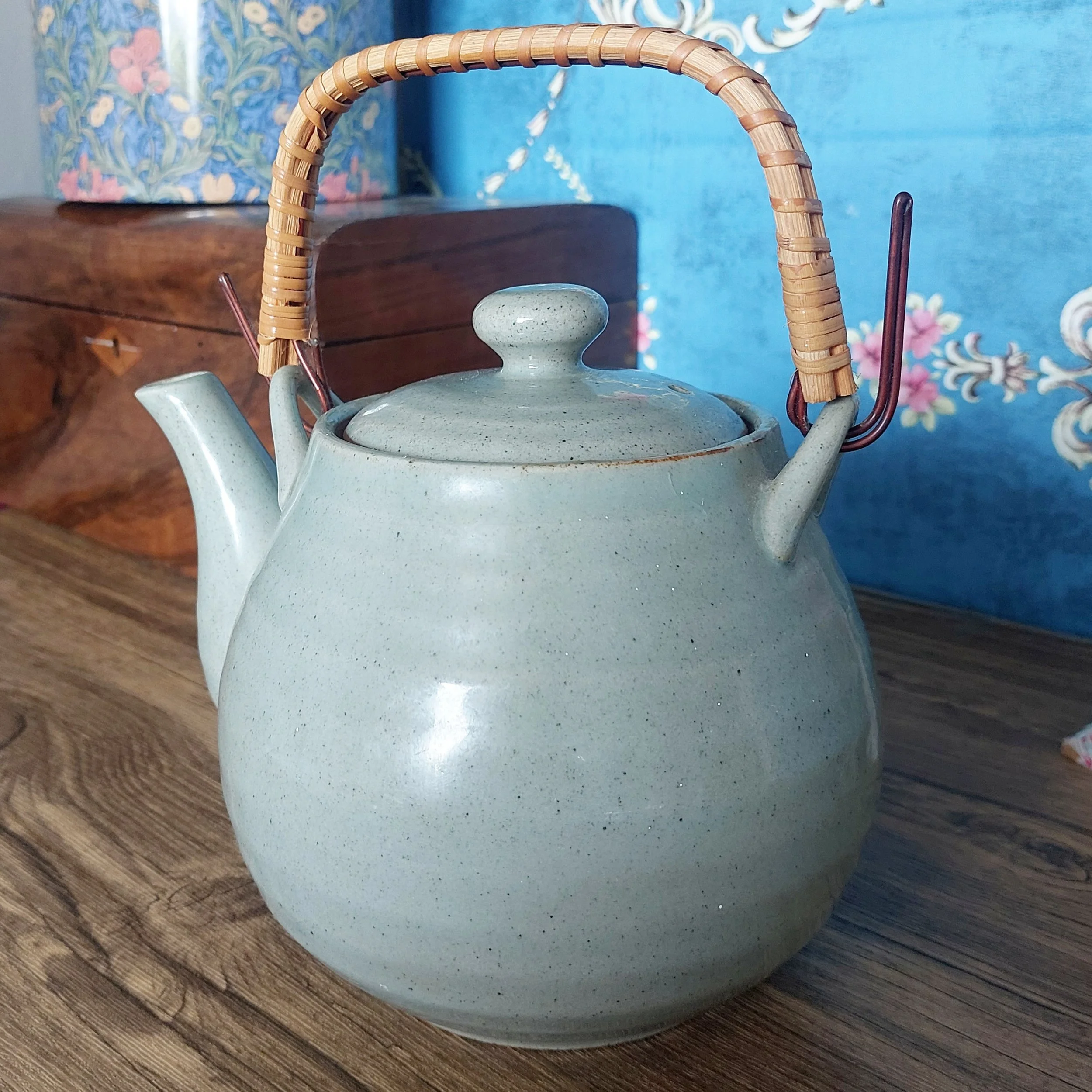 This beautiful vintage teapot, circa 1970s, is a stunning example of Japanese pottery. It features a speckled sage green glaze finish that adds a touch of rustic charm. The teapot’s rounded body is complemented by a short, functional spout and a snug-fitting lid, both accented with a warm brown hue that contrasts elegantly with the green-grey body. The handle, made from rattan, adds an organic element to the design, enhancing its artisanal appeal.